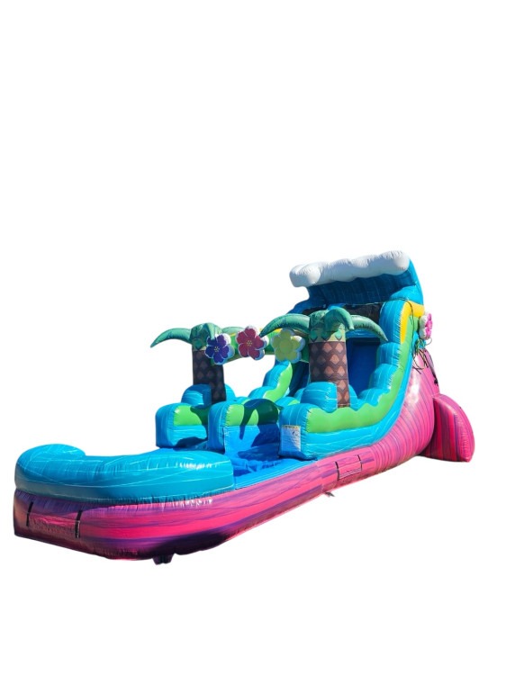 Bring a bright tropical vibe to your event with this 16' Luau rental. Designed with a fun island theme, it features colorful palm trees, bold tropical accents, and a playful look that stands out at birthdays, summer parties, school events, and backyard celebrations. The tall slide creates an exciting ride while the front landing area adds to the fun and makes it a lively centerpiece for guests. Its vibrant blue, green, pink, and purple colors give it a cheerful, beach-inspired feel that works especially well for warm-weather parties and luau-themed gatherings. This rental is a great way to add a festive, eye-catching attraction that feels fun, energetic, and unforgettable.